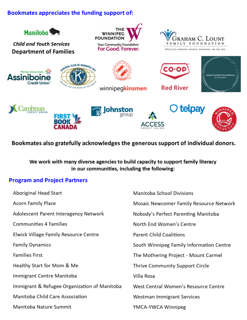 Bookmates is a Manitoba based not-for-profit organization, established in 1984. For over 40 years we have proudly promoted and supported family literacy in communities across the province and beyond in partnership with a wide variety of groups and organizations. We are the only non-profit organization in Manitoba focussed solely on providing family literacy services.